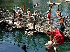 The attraction itself has been loaded with special effects, live pirates skulking about and activity areas for visitors to discover hidden treasure. In one cove, guests can maneuver pumps that reveal a sunken ship and skeletal pirates still clinging to what lies beneath. Other new aspects include a "bone cage," taken from the "Pirates of the Caribbean" movie, in which guests can appear as if they're suspended under water; a treasure room dutifully protected by Capt. Jack Sparrow, the movie's hero; and a live action show featuring Sparrow as a swashbuckler.