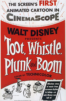 From Vault Disney: A few weeks ago I played a Disneyland Record, "A Child's Introduction to Melody" based on the short, "Toot Whistle, Plunk, and Boom". Well your response was overwhelmingly positive but you asked, "What about the original cartoon"? The short was originally released to theaters in 1953 and made use of the then new widescreen format and novel stereophonic sound. It finally found life on DVD when it was released early on in the Walt Disney Treasures series called, "Disney Rarites" and I present the entire short for you here. If you've never seen it, you can find it on youtube, albeit with rather poor audio quality. Still, it's absolutely worth seeing.